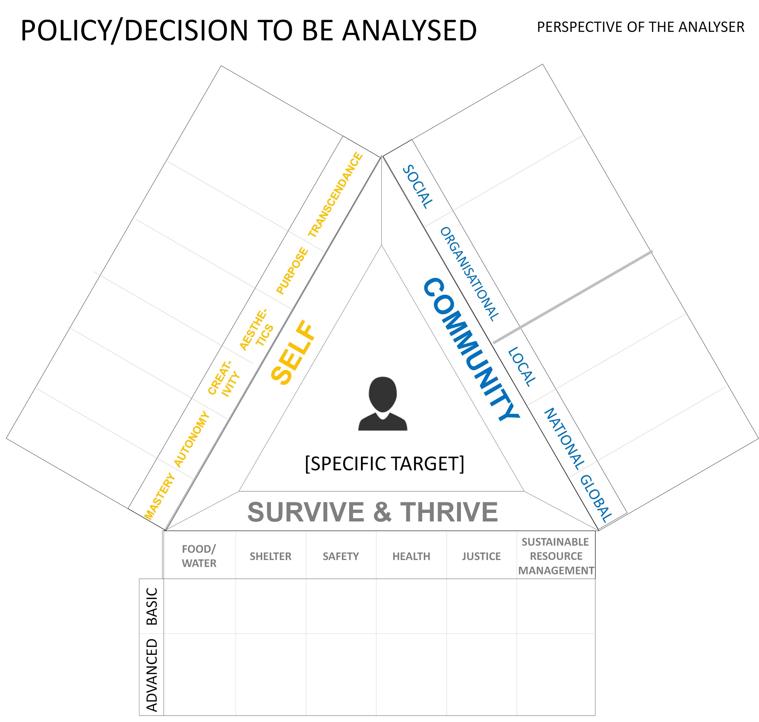 There are two levels to this side of the triangle: "Basic" and "Advanced". This is why the subtitle is Survive and Thrive. Though we must be vigilant new policies do not undermine access to basic needs (this might seem trivial but are we really avoiding this when subsidising the oil industry?), we must also continuously strive to improve the quality in all these categories. This is not a linear process and we are constantly facing decisions that could undermine the progress attained. Here are just a few current illustrations from this side of the pond : water quality in Flint, MI, fighting the minimal living size of apartments in New York City, Black lives Matter, not allowing gun violence to be studied, LGBT rights.