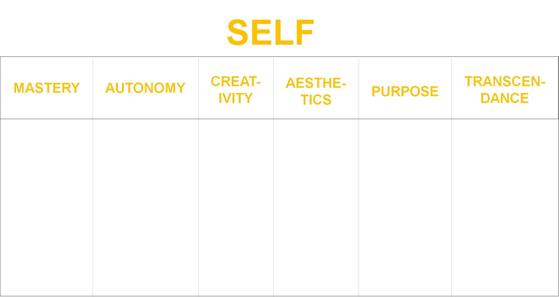 This is one area, I do not feel as of yet comfortable enough with my knowledge. I am still working on the subcategories that the self needs to be completely but not redundantly described. For now these are the aspects I feel best cover what is sometimes referred to as Self-Actualisation (realising personal potential, self-fulfilment, seeking personal growth and peak experiences), the personal aspects that contribute to our well-being. They are organised from the most inward looking to the most outward looking: