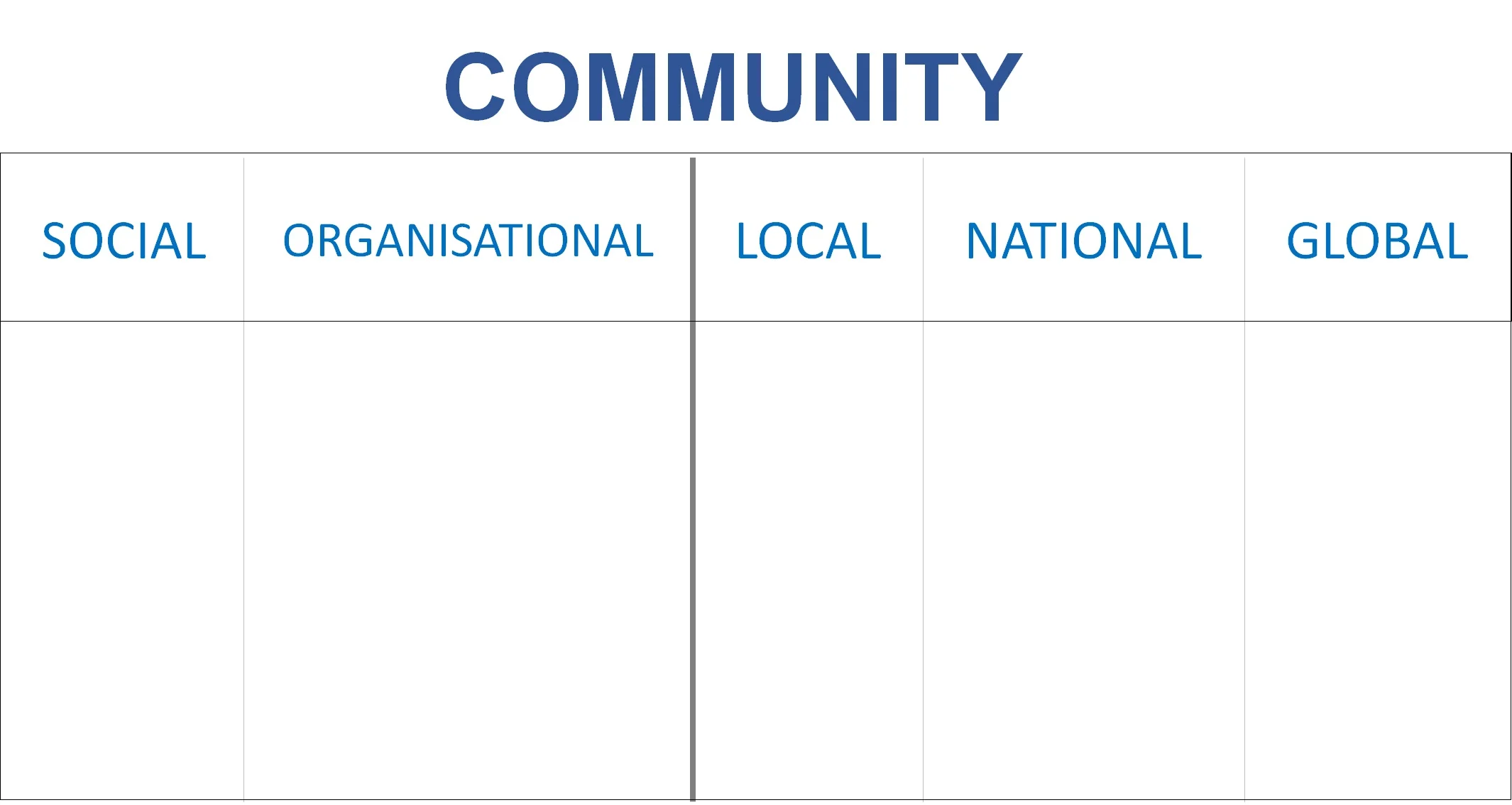 The outward facing side of the triangle is called "Community" and is sub-divided into two large categories. One category is divided between one's personal and professional life (which in a globalized world does not necessarily have a geographical logic), the other category is geographical in nature (local, national and global). "Local" is whatever makes more sense to the studied group (neighbourhood, municipal, regional, etc.).